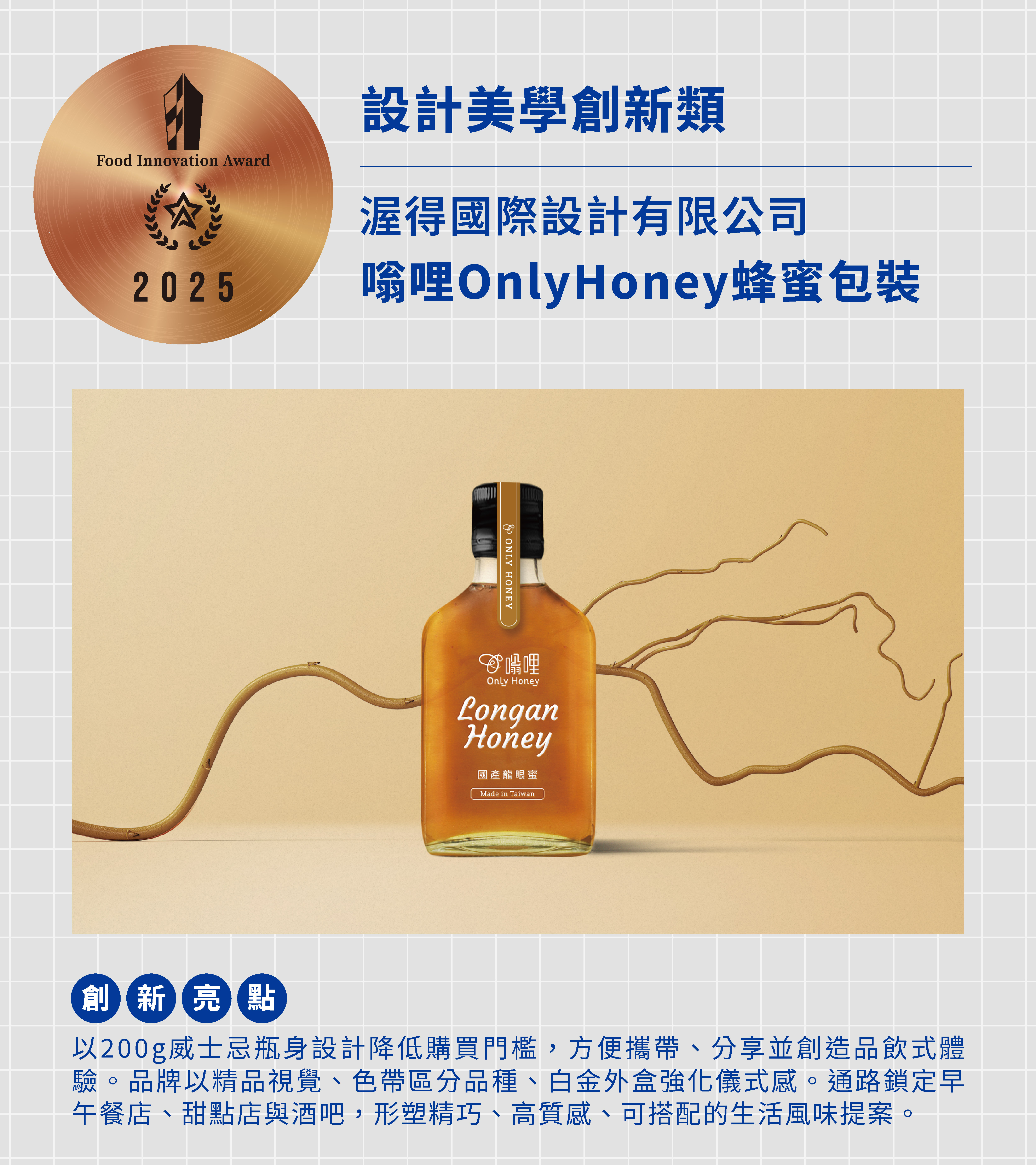 本屆食創奬設計美學創新類別,共有6個方案獲得一星肯定。渥得國際設計「嗡哩OnlyHoney蜂蜜包裝」產品,以200克威士忌瓶身設計,精巧易攜,與市面上常見的700克大瓶蜂蜜形成區隔,讓消費者容易入手與嘗鮮,包裝風格採布爾喬亞精品概念,標誌設計流暢如手寫字體,整體呈現俐落高雅的質感,突顯蜂蜜的珍貴價值。謝榮雅指出,以威士忌瓶身設計,很適合小家庭的使用,整體包裝起來送禮,也非常漂亮。