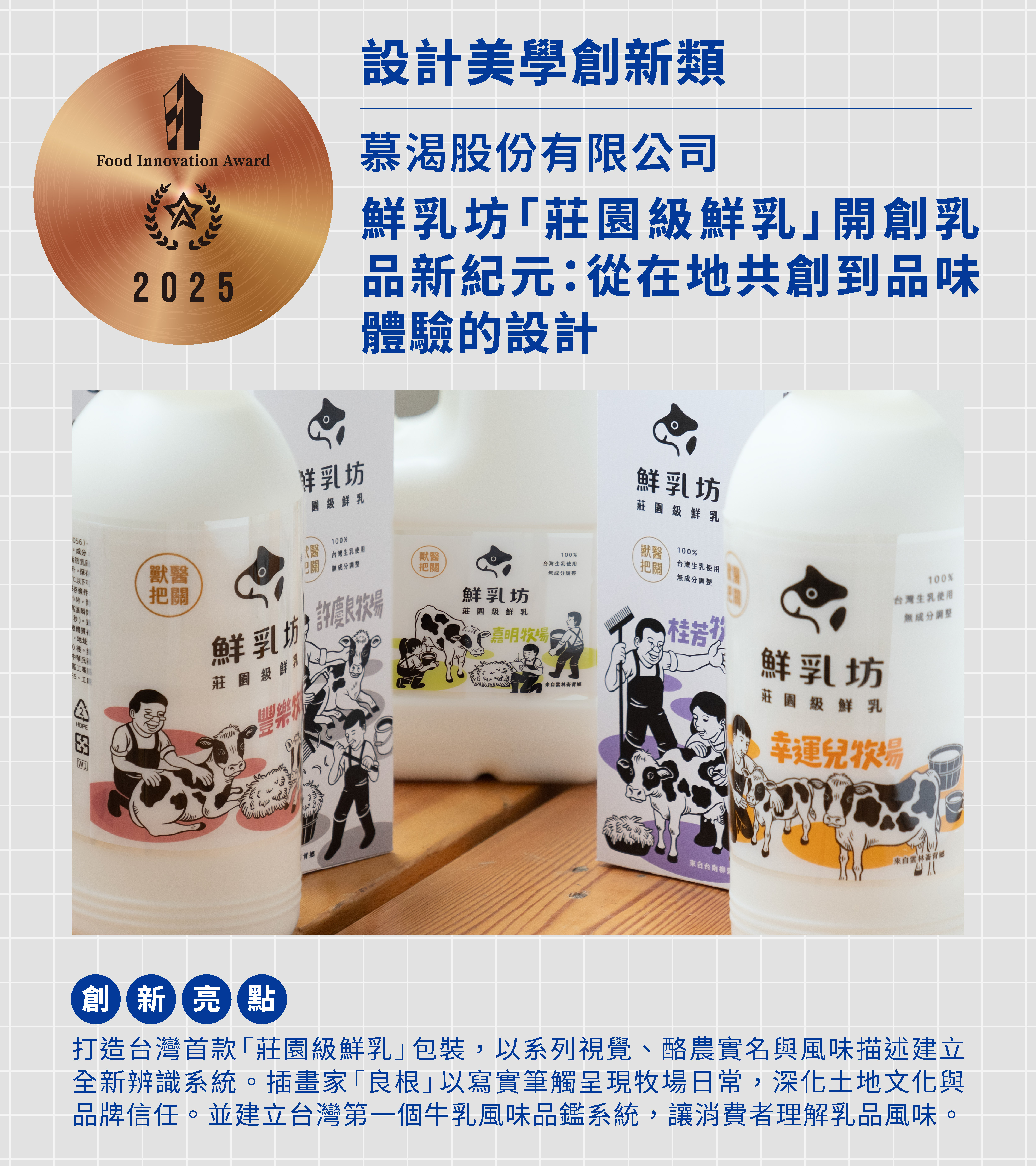 「鮮乳坊『莊園級鮮乳』開創乳品新紀元:從在地共創到品味體驗的設計」,讓台灣酪農被消費者看見,進而支持台灣本土酪農業發展。面臨2025年台紐零關稅實施,大量進口乳品湧入及市面上小農訴求的乳品多元混雜,消費者難以辨識品牌與品質,鮮乳坊與酪農合作,推出「莊園級鮮乳」。