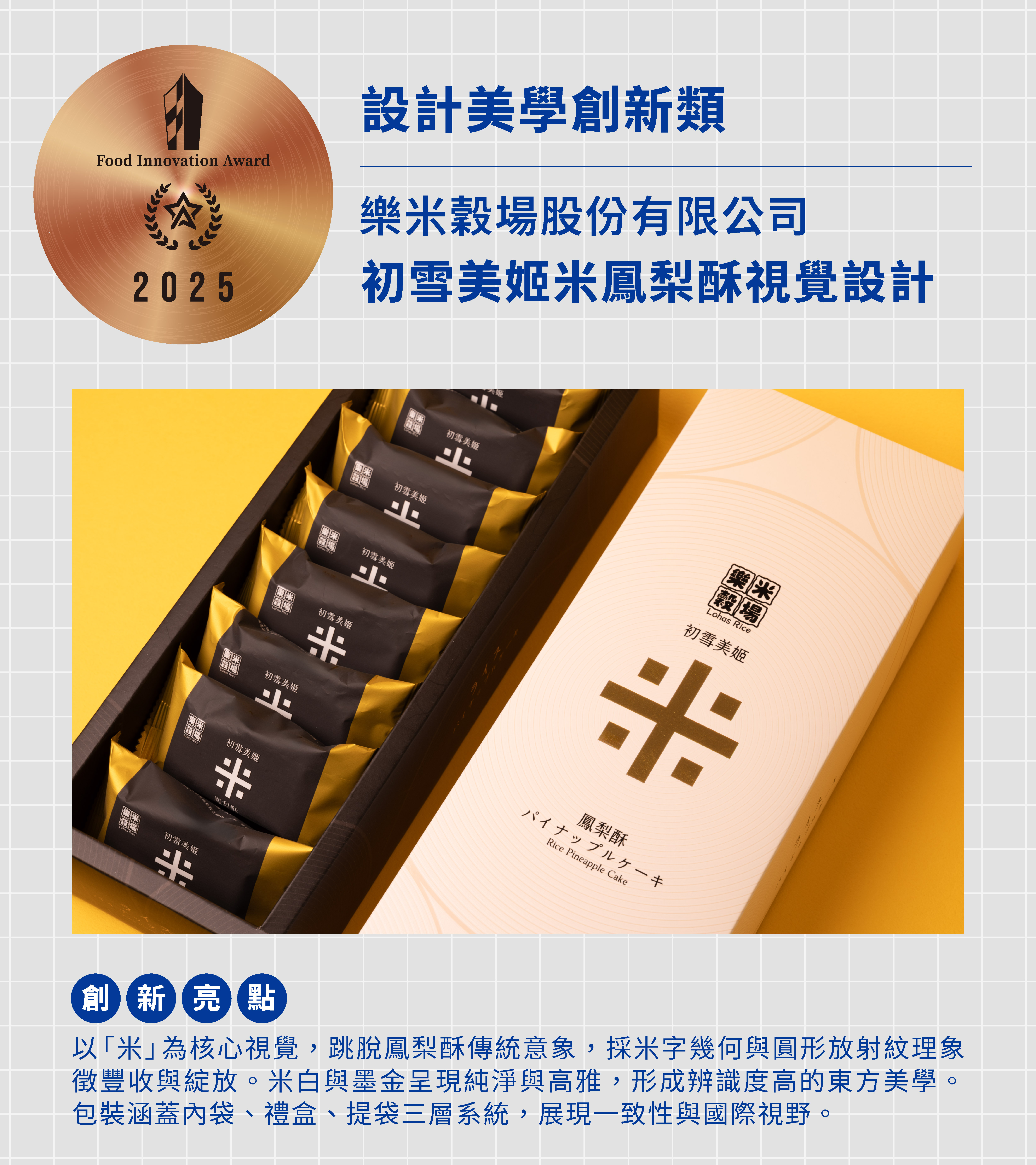 除了蜂蜜、鮮奶,來自花東縱谷的樂米穀場「初雪美姬米鳳梨酥視覺設計」也得到一星。 2024年有「米界奧斯卡」之稱的包裝米年度大獎「精饌米獎」,「樂米穀場」旗下產品「臺東池上產新月豔姬」、「臺東池上競賽履歷米」,分別獲得香米組及非香米組金質獎,雙金入袋,堪稱最大贏家。