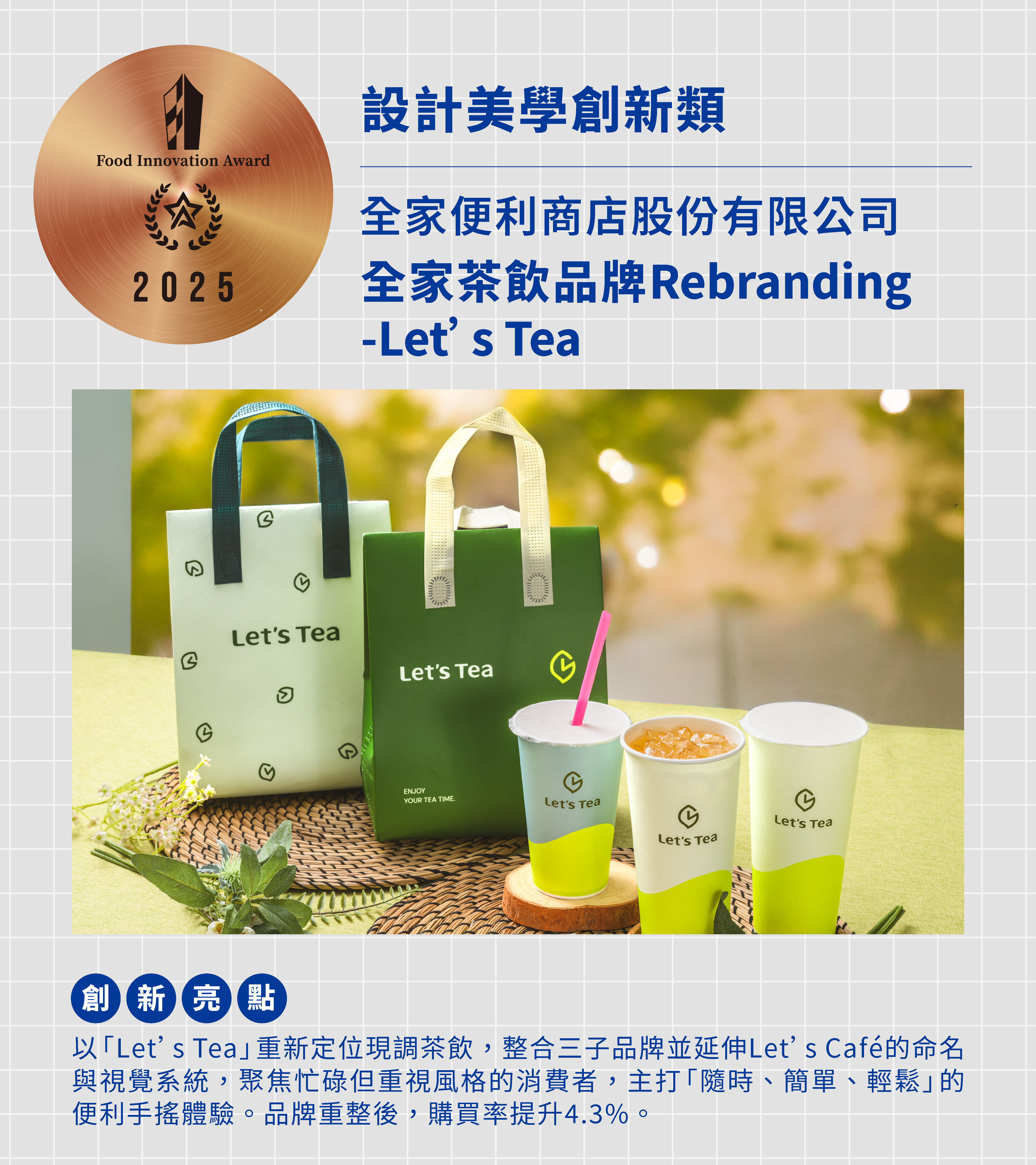 2025年全家重新定位現調茶飲品牌、「全家茶飲品牌Rebranding-Let’s Tea」方案,瞄準「便利手搖」市場推出全新品牌「Let’s Tea」,整合「私品茶」、「搖搖茶吧」、「福爾摩沙茶館」三個子品牌,讓視覺系統一致,也是延伸自既有現調咖啡品牌「Let’s Café」,利用同樣的命名邏輯與設計語彙,降低品牌認知門檻。