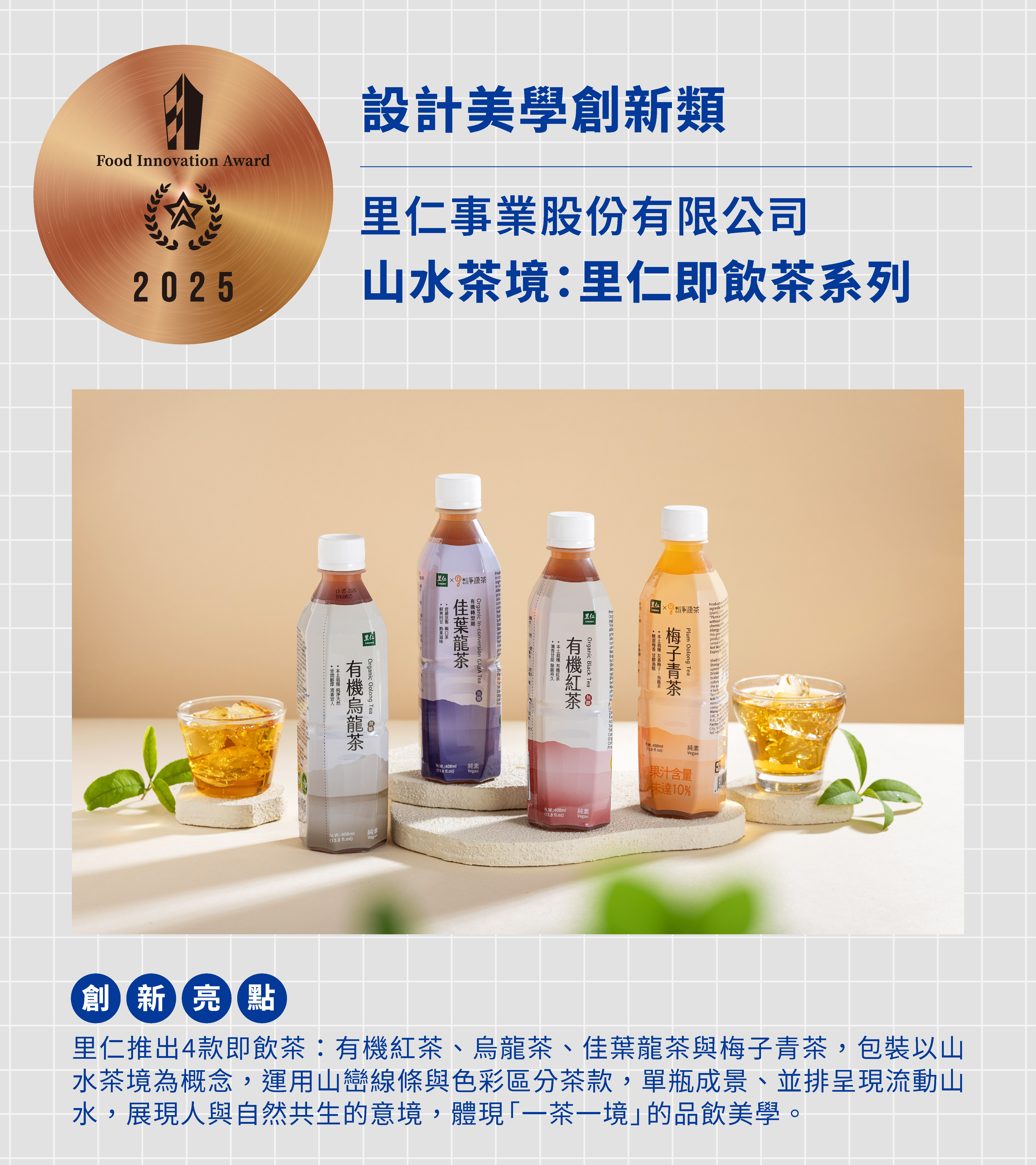 謝榮雅指出,山水茶境設計完全延續里仁品牌的意向,每款茶飲以不同色系呈現,但字體、版式與整體語彙保持一致,成功奠定系列識別的一致性,不僅展現大品牌的穩定性與文化厚度,更讓產品本身成為傳遞理念的介面。