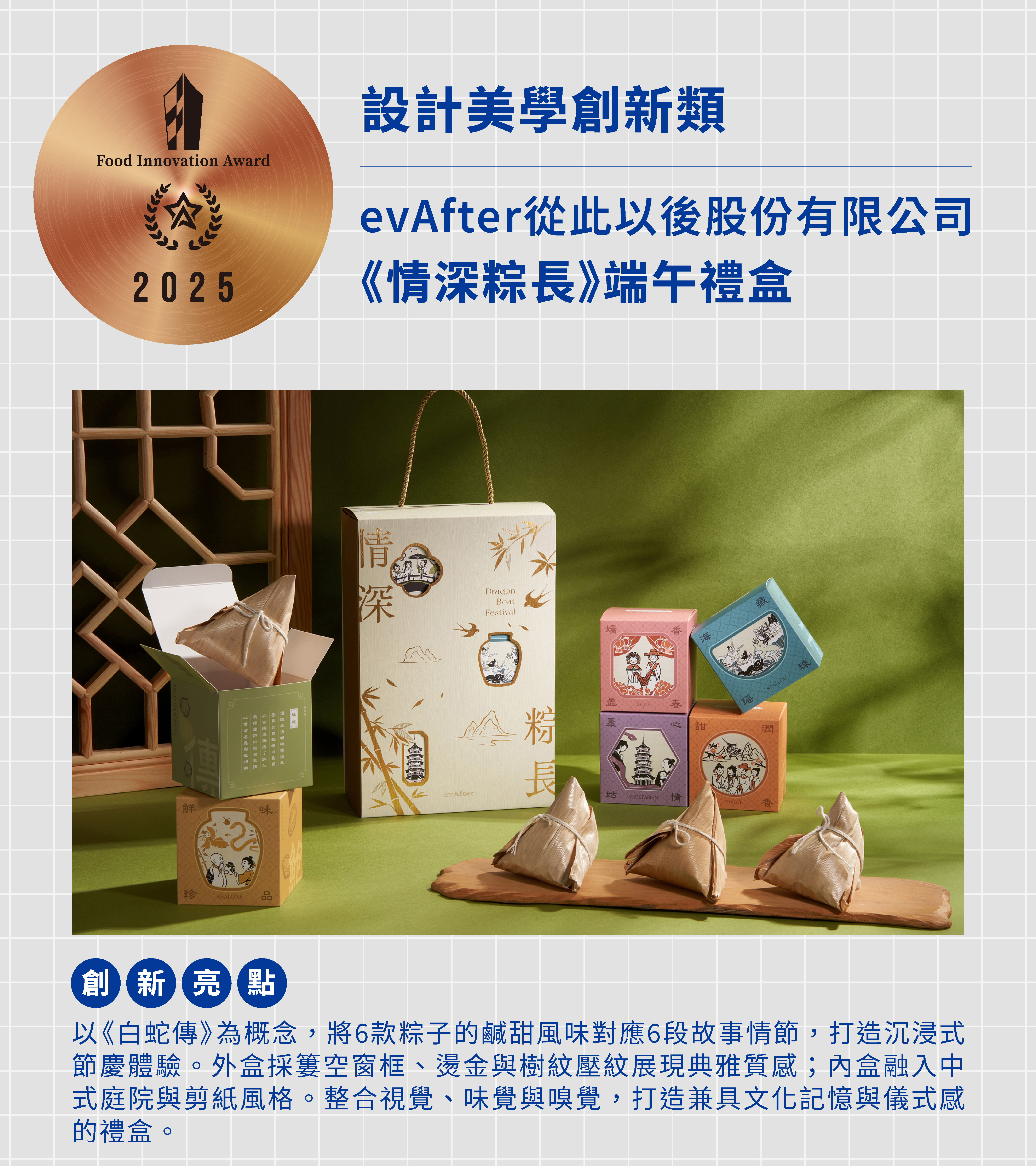 另一個展現東方文化設計的《情深粽長》端午禮盒。「evAfter 從此以後」為以彌月為起點的品牌,這次設計粽子禮盒,以經典文學作品《白蛇傳》為靈感,將端午節傳統習俗與民間故事,轉化為具有收藏價值的節慶禮盒設計,希望端午不只是吃粽子,還可回憶傳統習俗和民間故事。讓送禮不只是形式,更成為一場深具意義的文化交流和情感連結,呼應當前趨勢。