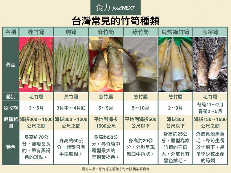 台灣位於熱帶與亞帶熱地區,幾乎一年四季,從北到南都可以種植竹筍,從春季的桂竹筍、劍筍,夏季的麻竹筍、綠竹筍、烏殼綠竹筍,到冬季的孟宗筍,你分得清楚嗎?