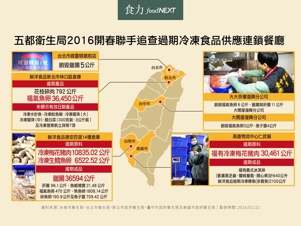 經過連續多日跨五都追查,分別在鮮洋食品與福有企業北中南三地倉庫查獲逾期原料與逾期產品包括:台南倉庫查出逾期梅花豬肉10835.02公斤、冷凍生鱈魚卵6522.52公斤,7項逾期成品為臘腸36594公斤、肝腸96.1公斤、魚蝦燒賣21.48公斤、福氣魚卵470公斤、熟魚卵1808.14公斤、碎魚卵190.9公斤及魚子醬709.42公斤。新北市林口區倉庫查獲逾期產品花枝碎肉792公斤及福氣魚卵36,450公斤,另查獲未標示有效日期的冷凍水針魚、冷凍魷魚喉、冷凍龍珠、酸白菜及冷凍潮煮帆立貝等7項產品。在高雄市仁武倉庫,則查獲逾有效日期的冷凍多寶魚產品2種規格共計140箱(15公斤/箱)以及福有企業的義式冰淇淋(香濃黑芝麻、蘭姆葡萄、開心果)計640公升。