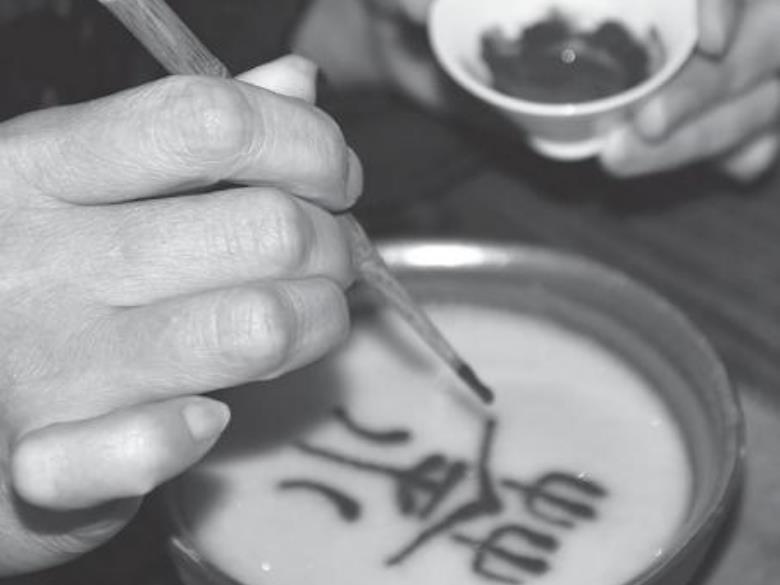 第一種,把茶湯點得特別稠,像稠粥一樣,然後用一根頂端略有突起的細竹棍兒蘸著更為濃稠的茶糊在茶湯的表面輕輕勾畫。這種方法比較簡單,相對容易掌握,勾畫出來的圖案又能保持較長時間,便於讓推廣宋茶的現代茶商向媒體和顧客展示。但是請注意,這個方法並不入流,放在宋朝是會受人恥笑的。第二種,先點出半碗茶湯,不要點那麼稠,但是一定要點出厚厚的泡沫,然後注入細細的水流,一邊注水,一邊有規律地傾斜和轉動茶碗,此時就會有青黑的圖案從碗底冒出來......這才是正宗的宋朝分茶。和前一個方法相比,這個方法要難得多,必須靠不斷摸索和艱苦練習才能掌握其基本要領。