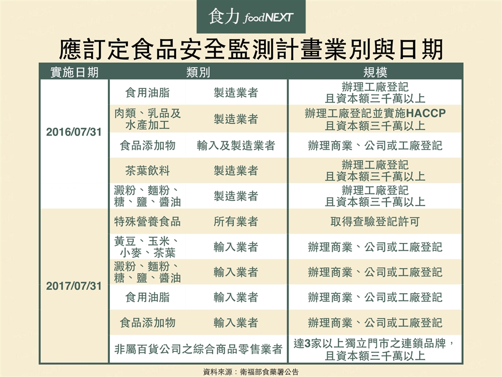 依據食品安全衛生管理法第7條第1項規定「食品業者應實施自主管理,訂定食品安全監測計畫,確保食品衛生安全」,因此2015年12月30日衛福部食藥署預告,食用油脂、肉類加工食品、乳品加工食品、水產品食品、食品添加物、特殊營養食品、黃豆、玉米、小麥、麵粉、澱粉、食鹽、糖、醬油、茶葉、茶葉飲料及非百貨公司之綜合零售業者等17類食品業者,將於2016年7月底前分階段要求訂定食品安全監測計畫。