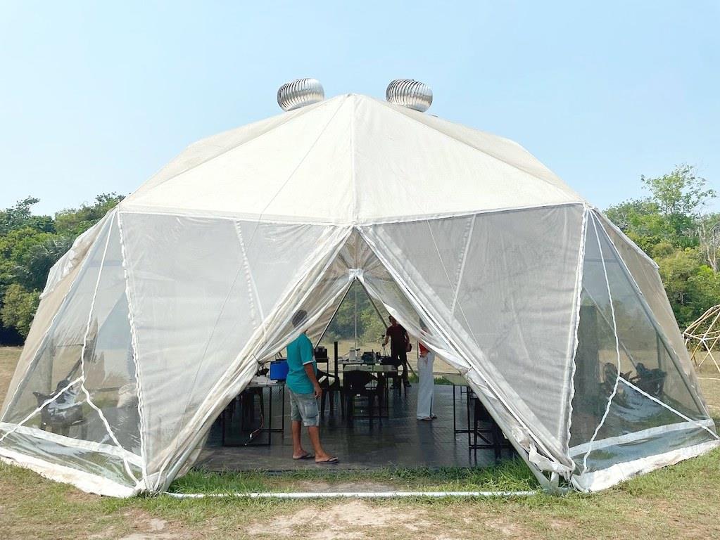 生態工廠就在穹頂帳篷內,幾天的時間就能組裝、拆除,再移往不同社區。(圖片來源:Sônia Soares/亞馬遜4.0學院,環境資訊中心提供)