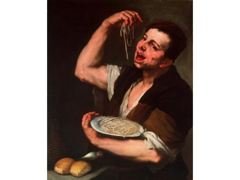 來自拿坡里的盧卡.喬爾達諾是17世紀最受人喜愛的巴洛克畫家之一,其創作速度非常快,有「快手盧卡」的美譽。在〈味覺的寓意:吃義大利麵的人〉這幅畫裡,我們可以看見一個用手抓義大利麵,吃的津津有味的男孩。雖然在義大利料理史上,義大利麵佔有重要的地位,卻幾乎沒有畫家繪製吃義大利麵的人,其中一個原因,可能是因為人們在吃義大利麵時,並不「美觀」。