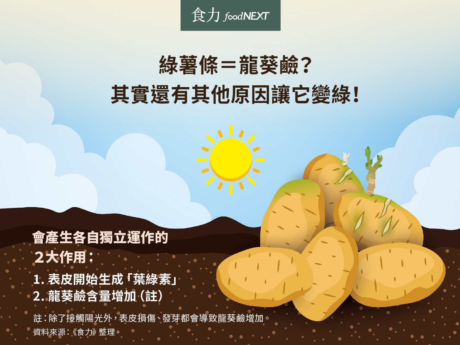 因此,「發芽或變綠」並非直接等於有毒,而是代表潛在風險提高。在無法檢測的情況下,避免食用,成為消費端長期形成的安全原則。