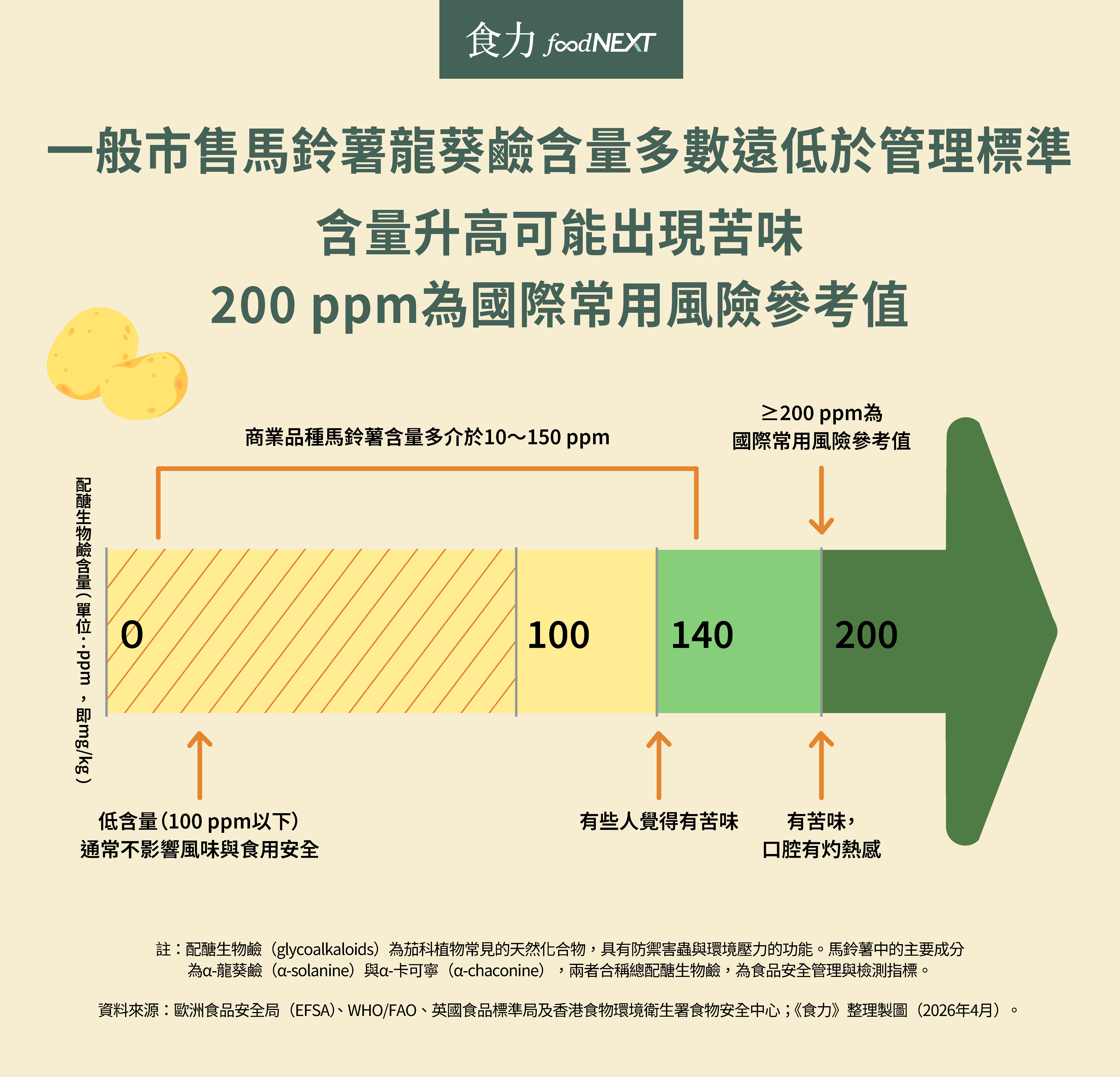 在正常供應鏈條件下,多數商業品種馬鈴薯的總配醣生物鹼(TGA)含量,於「採收後至進入市場前」的監控數據通常落在約10~150 ppm之間,明顯低於200 ppm的法規風險參考值。