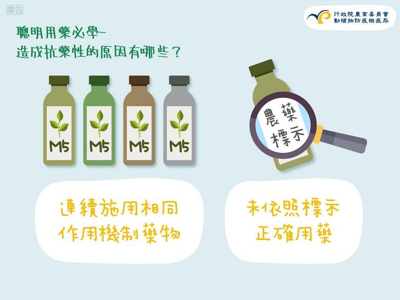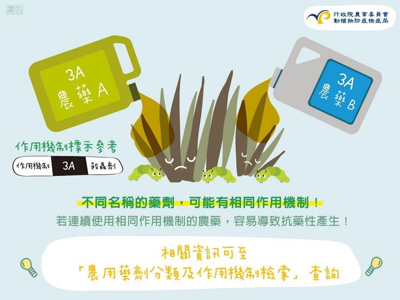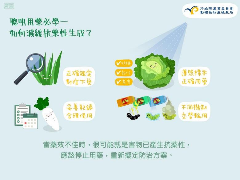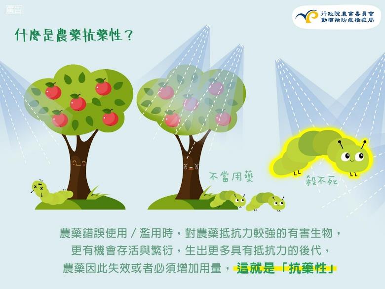 「農藥抗藥性」指的是病蟲害族群對於農藥的抵抗能力增強,使得農藥失效或者須增加用藥量才能達到效果,而減少農藥抗藥性的四大重點為:對症下藥、正確用藥、妥善記錄、交替輪用。