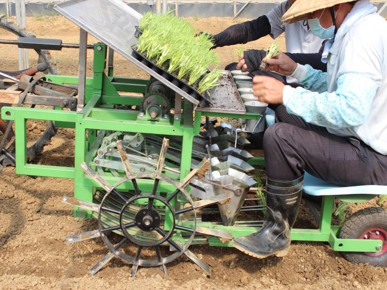 農委會桃園區農業改良場因為國內蔬菜種植缺工問題,經過多年研發,成功推出國產第一台「可變行株距葉菜移植機」,不僅可一次種植多行,增加移植效率,也可因應種植不同蔬菜更改株距,露天、溫網室設施一機搞定。機身則設計1人駕駛,2人以坐式進行供苗作業,省工又省力,讓農夫可以減少傳統人工蹲姿移植方式造成的職業傷害。