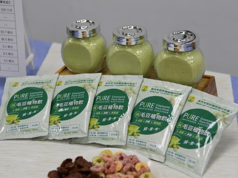 高雄農改場利用乾燥濃縮及微細化等加工技術,將過去外觀不佳、無法外銷的毛豆格外品賦予全新價值,推出國產高機能性的毛豆植物飲產品。