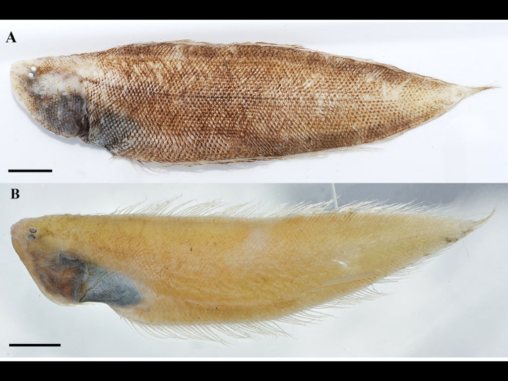 尖吻無線鰨(Symphurus oxyrhynchus))標本照:A採自日本土佐灣的正模標本;B採自臺灣小琉球南方海域的副模標本。(圖片來源:農委會提供)