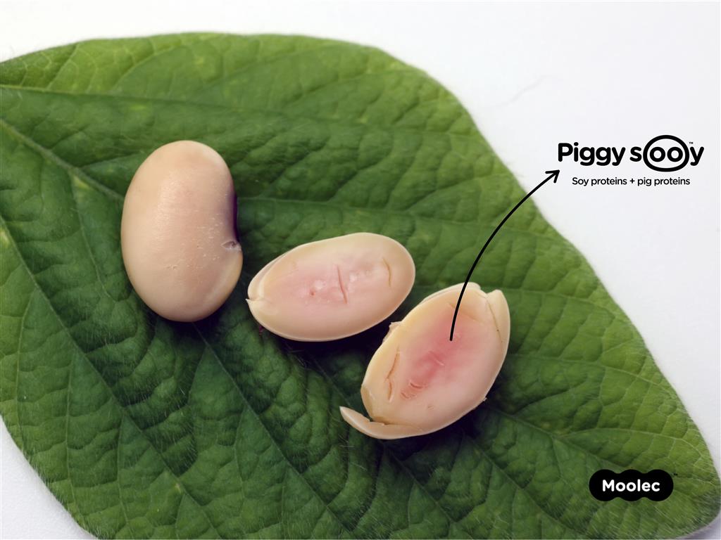 分子農場公司「Moolec Science」於2023年6月26日發表「Piggy Sooy」的研發,透過基改技術將豬肉蛋白質應用在黃豆中,讓其可溶性蛋白質高達26.6%!而具動物性蛋白的特性更可以改善豆製品的風味、營養與質地。