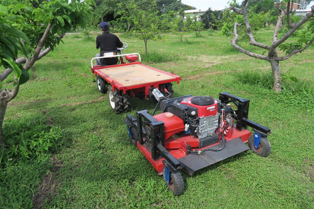 為解決果園使用背負式割草機耗時費工的問題,行政院農業委員會臺東區農業改良場(簡稱臺東場)研製「附掛式果園割草裝置」,以常用之小型搬運車為行走動力,進行果園乘坐式割草。
