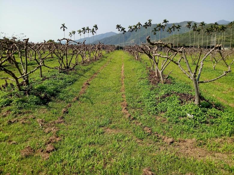 台東場進一步說明,相較於全園清耕管理或全園草生栽培,更多農友採行的是介於兩者之間的帶狀草生栽培管理,僅於特定時間施用除草劑,而其他時間則維持草生管理模式,然而未來氣候變遷預估將更加劇烈,急降雨及長時間乾旱現象勢必將嚴重影響果樹的生長,因而具備減緩果園遭受環境衝擊效能的草生栽培,將會是重要的預防措施,因此減少除草劑的施用,讓果園維持草類生長的管理方式,無形中也能降低果園管理時的環境風險。