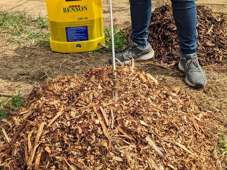 利用碎枝機將果樹枝條管理留下的殘枝攪碎後,益菌肥液化施灑後能加速軟化,可增加土地有機質、降低處理成本。(圖片來源:高雄市政府農業局提供)
