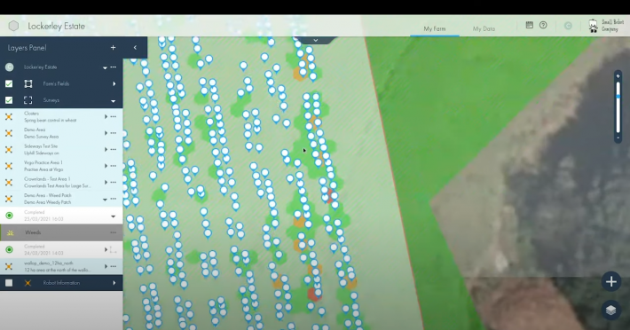 SRC 的人工智慧系統 Wilma 能夠吸收 Tom 收集到的資訊,並把數據轉換成每株植物的健康狀況,圖中每一個小圓點都含有雜草資訊。(圖片來源:社企流提供)