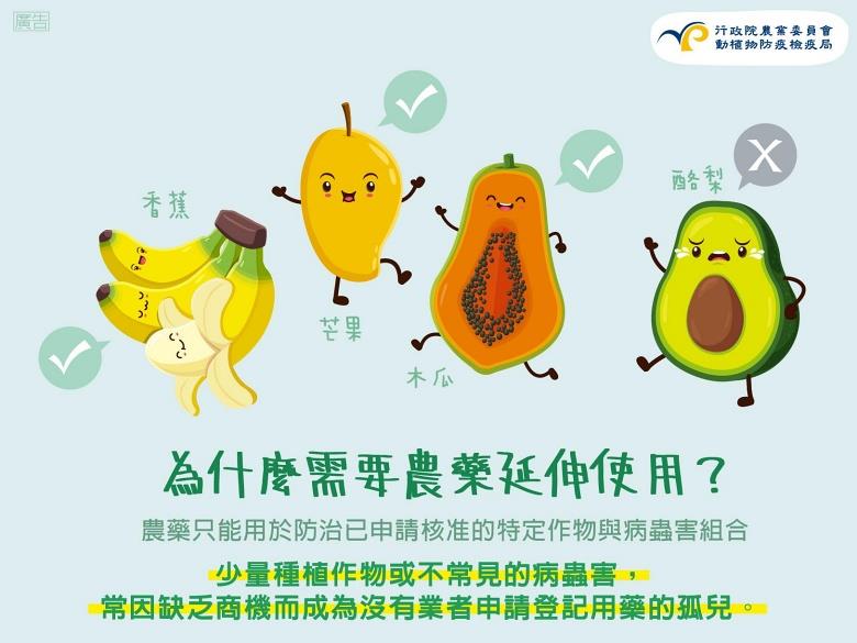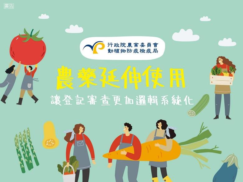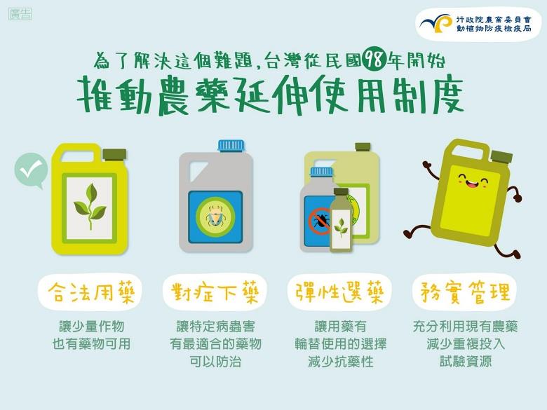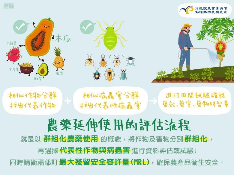 農藥延伸使用的原理,是將作物與病蟲害依照相似性建立群組化,以群中最具代表性的作物與病蟲害進行試驗與申請許可,舉例來說,大豆、紅豆、綠豆等豆科植物被分類在同群之中,A農藥在大豆上進行防治斜紋夜蛾類的田間試驗後,所獲得的結果能延伸應用在其他豆科的作物如紅豆、綠豆之中作為資料申請。如果能提出代表作物與代表害物的資料,就能申請延伸應用至同群中的作物,或者同群病蟲害,讓少量種植作物、較少見蟲害、不再成為無藥可用。