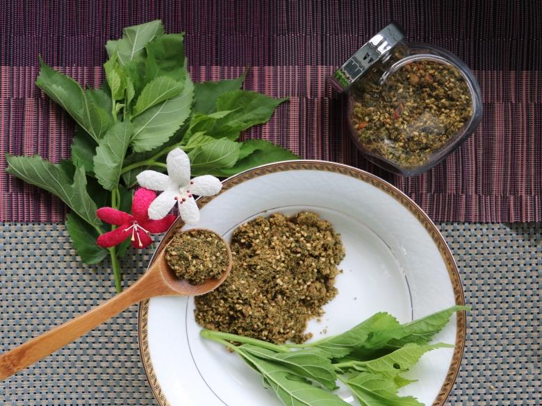 苗栗場特別以富含機能性的桑葉,取代一般市售香鬆產品添加的含碘海苔,開發出美味兼具健康的桑香鬆產品。(圖片來源:苗栗農改場提供)