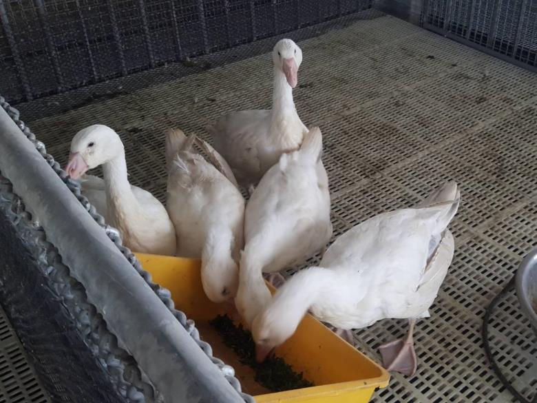 畜試所和苗栗場合作,以葉用枸杞的木質化莖稈為材料,加工製作成乾燥粉末,配製成各項健康的飼料配方,試驗結果顯示,飼糧添加葉用枸杞木質化莖稈,可提升鵝隻增重1.5%、飼料換肉率改善5.6%。