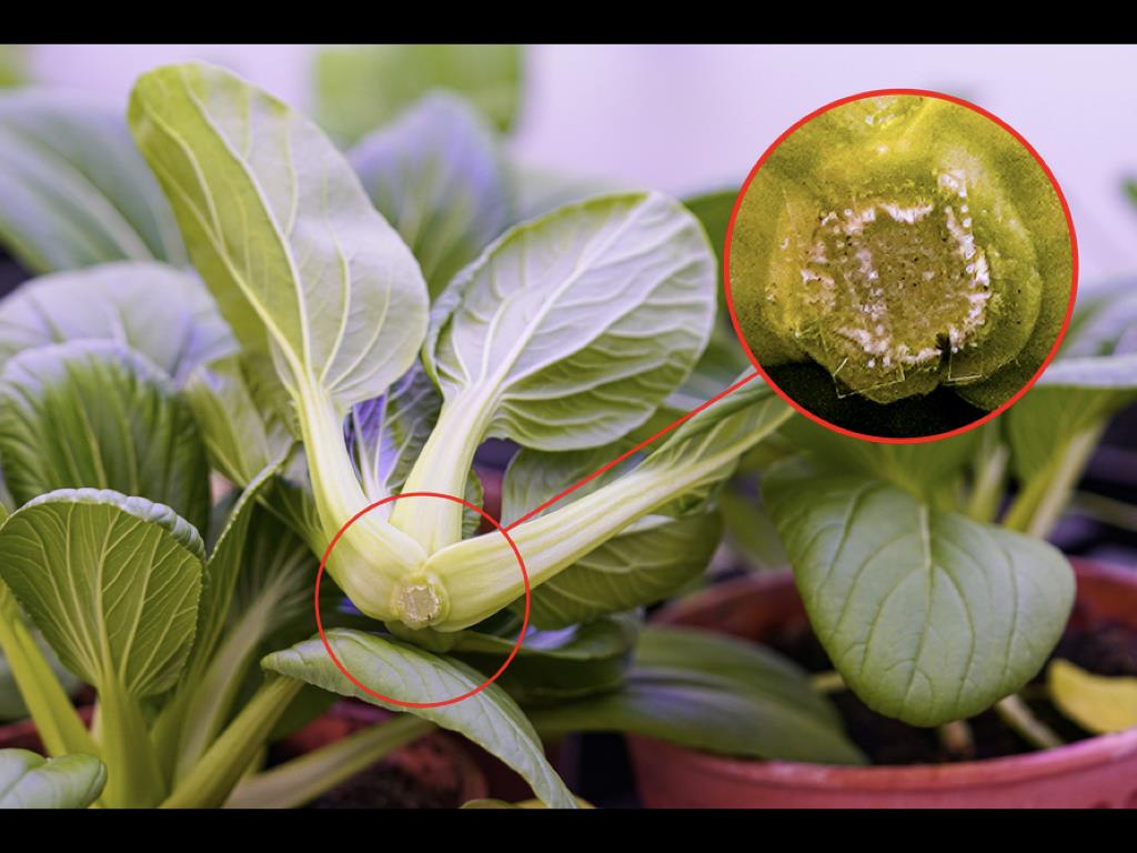 青江菜底部黏貼含有褪黑激素的微針貼片,可以觸發植物抗老化與保護機制。(圖片來源:MIT News)