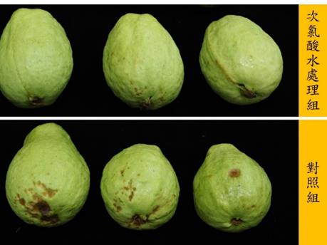 番石榴(俗稱芭樂)是台灣重要經濟作物,年產量約19萬公噸且全年供應,近年農業部積極推動番石榴外銷。以往在長程低溫儲運下,果實常因儲藏性病害而影響到貨品質。為改善該問題,台中農改場透過篩選次氯酸水等多種抑菌資材發現,以40ppm次氯酸水浸泡處理番石榴果實表面,可降低50%儲藏性病害之罹病率,有效改善果實儲運過程受病害影響品質之困境。