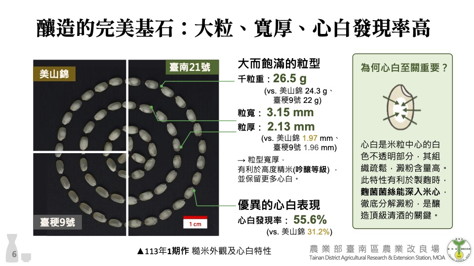 「臺南21號-南藏」其千粒重達26.5克,屬於大粒型米種;心白發現率達55.6%,高於多數在台種植的酒米;蛋白質含量相對較低,並具備穩定吸水與消化性,使其同時符合高端清酒對原料的結構性要求。具備三大特點: