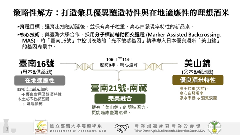 「臺南21號-南藏」的育種策略,即是針對這一問題進行改造。研究團隊以日本酒米「美山錦」為基礎,導入台灣品種「臺南16號」中具備延後成熟特性的基因,並透過分子標誌輔助回交育種技術進行選拔,歷時約8年完成新品種開發。