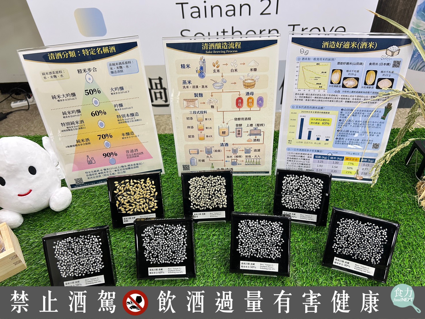 台灣首款清酒專用酒米「臺南21號-南藏」,搭配不同精米步合(如100%、90%、70%、60%、50%)展示,呈現從原料到釀造過程中,米粒結構與精磨比例如何影響清酒風味與等級。(呂玥攝)
